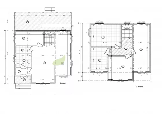 На 1 этаже дома расположены: прихожая 3 кв.м., котельная 5,2 кв.м., санузел 3 кв.м., гостиная 26 кв.м., кабинет 10 кв.м., кухня-столовая 17,7 м.кв, большая терраса 28 м.кв.; на 2 этаже – три изолированные комнаты 15,4/12,7/17,7 кв.м., санузел 8,9 кв.м., холл 6,6 кв.м.